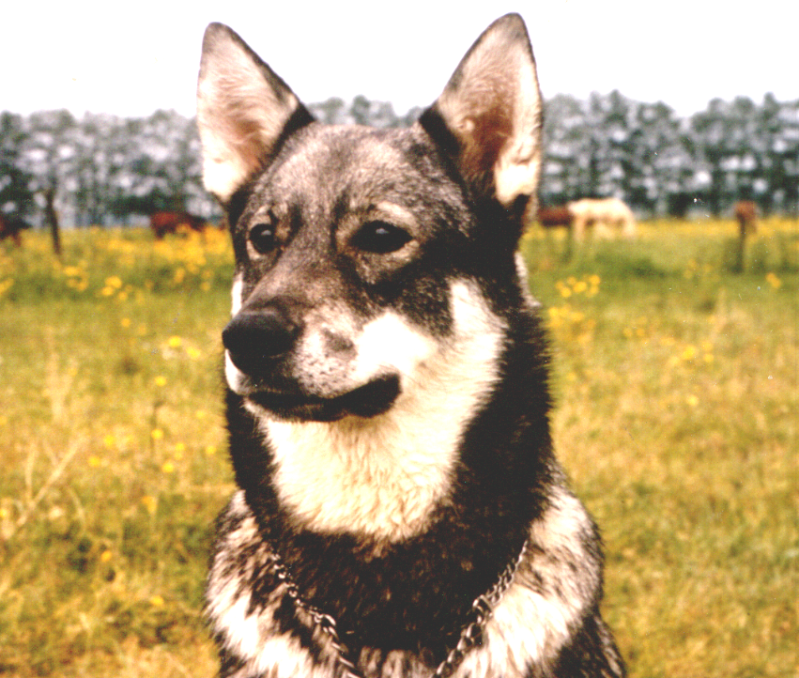 Mijn vurige wens was altijd nog eens een reu te hebben als die van dat bewuste plaatje, maar de echtgenote had alleszins begrijpelijke bezwaren. De kinderen nog niet groot genoeg, maar hoofdzakelijk; een reu tussen 3 Noorse Eland- en 'n Jämthond teven zag ze echt niet zitten. Geen kennel, een middelgrote tuin, maar wel schuifdeuren in huis, dat wel!